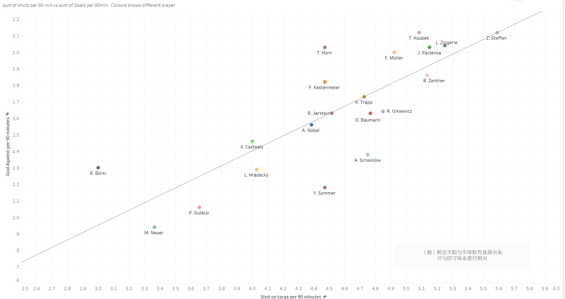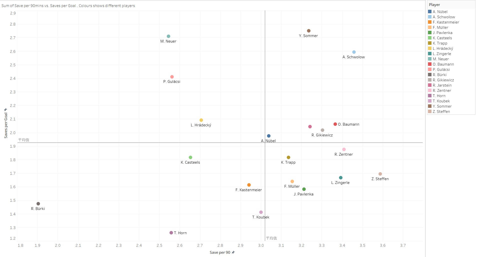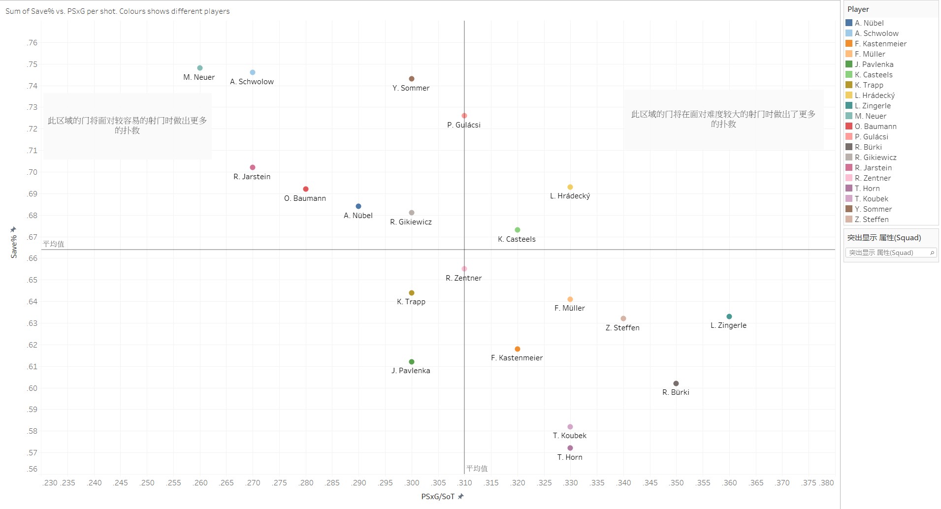 前者由门将的预期失球数除以面对的总射总数计算出来的。图中右上角区域的门将在面对难度较大的射门时做出更多的扑救,而左上角区域的门将则在面对较容易的射门时做出更多的扑救。