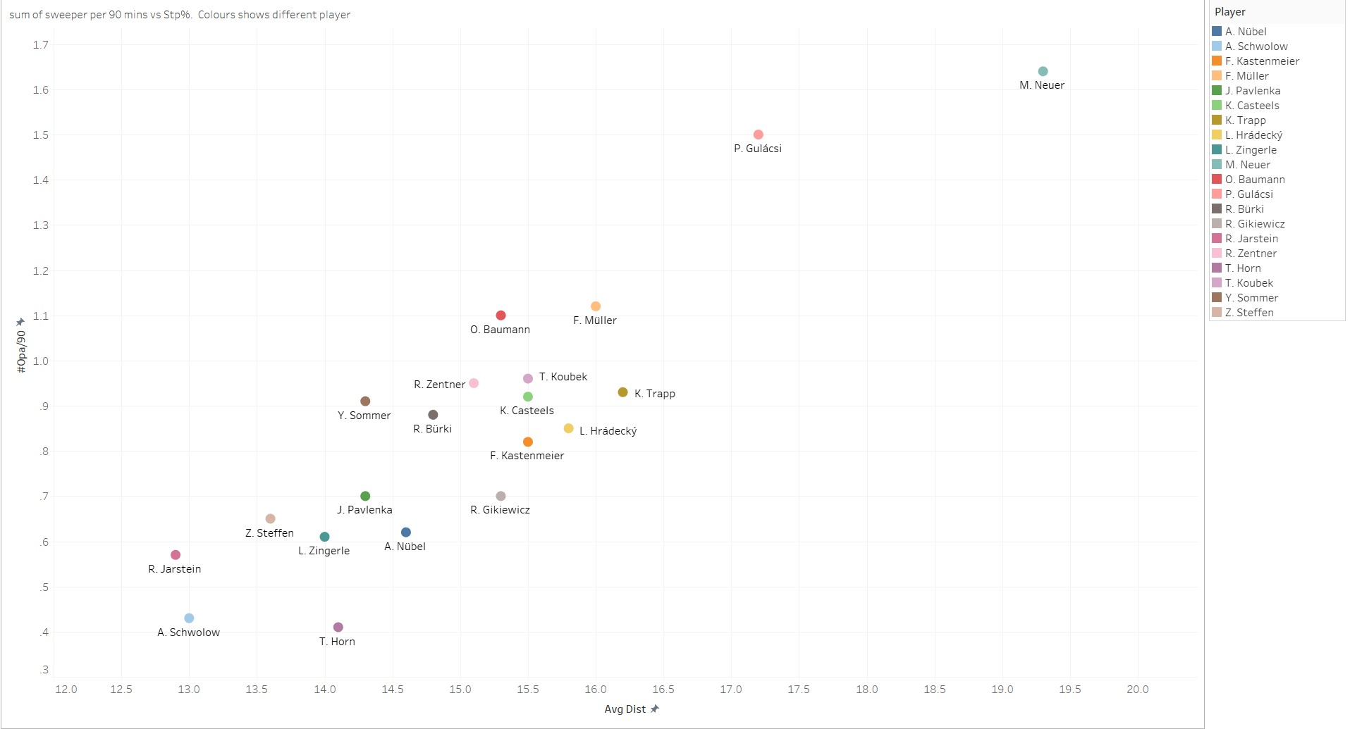 在这20名门将中,本赛季每场比赛的平均出击次数为0.864次,这意味着,对于大多数德甲门将来说,安全地呆在禁区或许是更好的选择。但对于一支习惯压上进攻的球队来说,拥有一名出击技术较强的门将无疑是化解对手防守反击的一大利器。