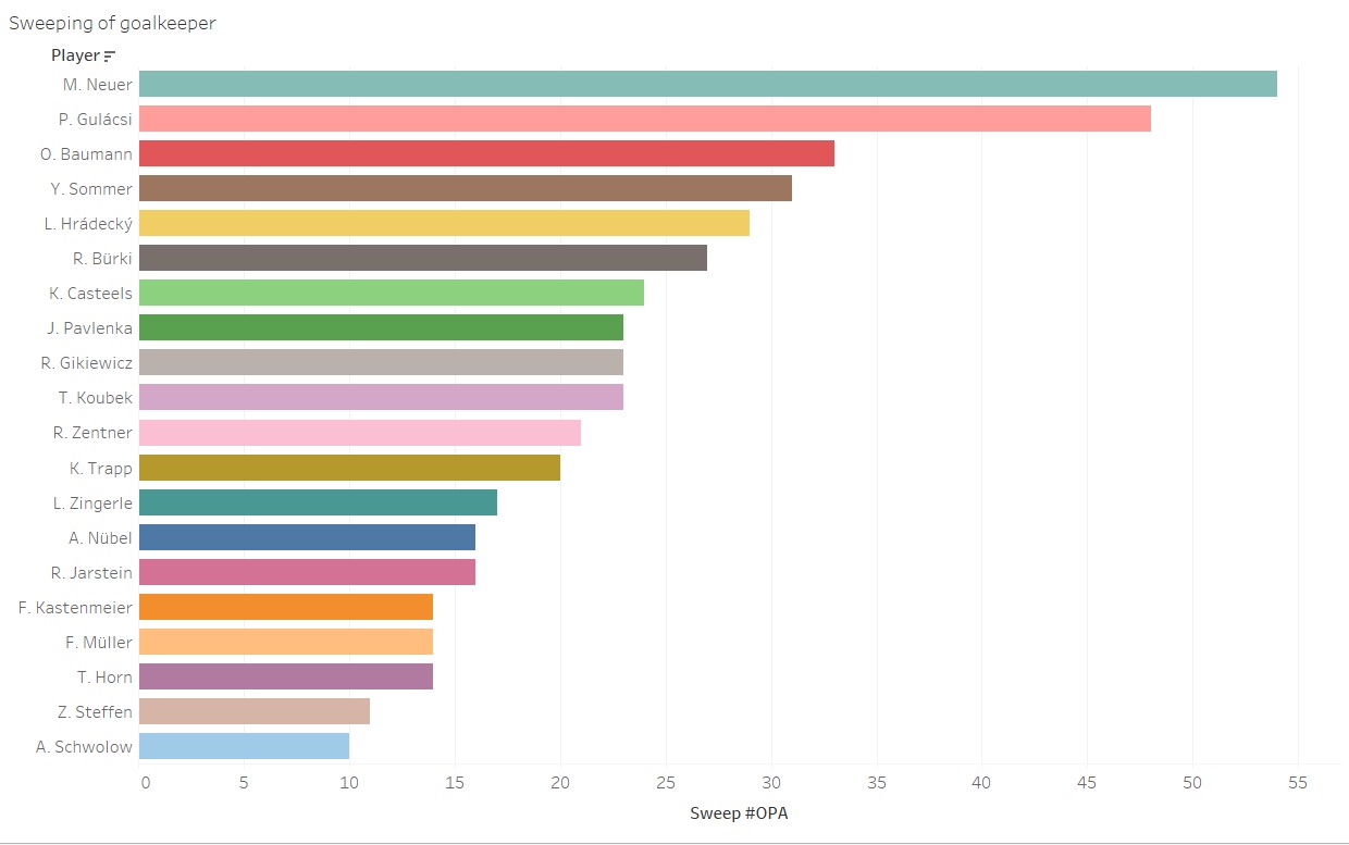 作为一名门将,虽然攻击性并不是必须的,但对于球队的防守来说,一名具有攻击性的门将是非常有帮助的。在本段的数据分析中,我们将通过对每个门将的出击频率、出击次数、出击距离进行分析,评估门将的攻击性。