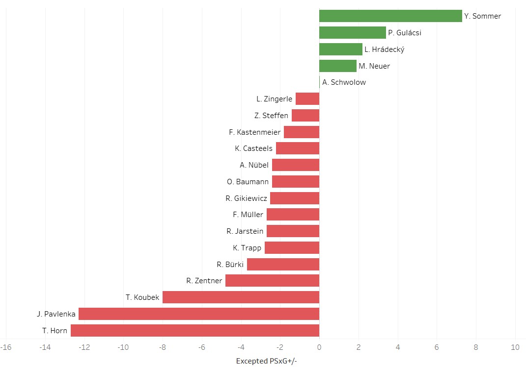 索默在这里遥遥领先,比预期多扑出了7.3个球。对于门兴来说,索默的出色表现是他们球队成功必不可少的一环。