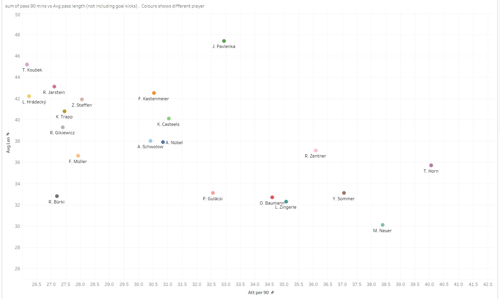 下图是德甲每位门将的传球数据,平均90分钟的传球次数和传球的距离(不包括球门球)。