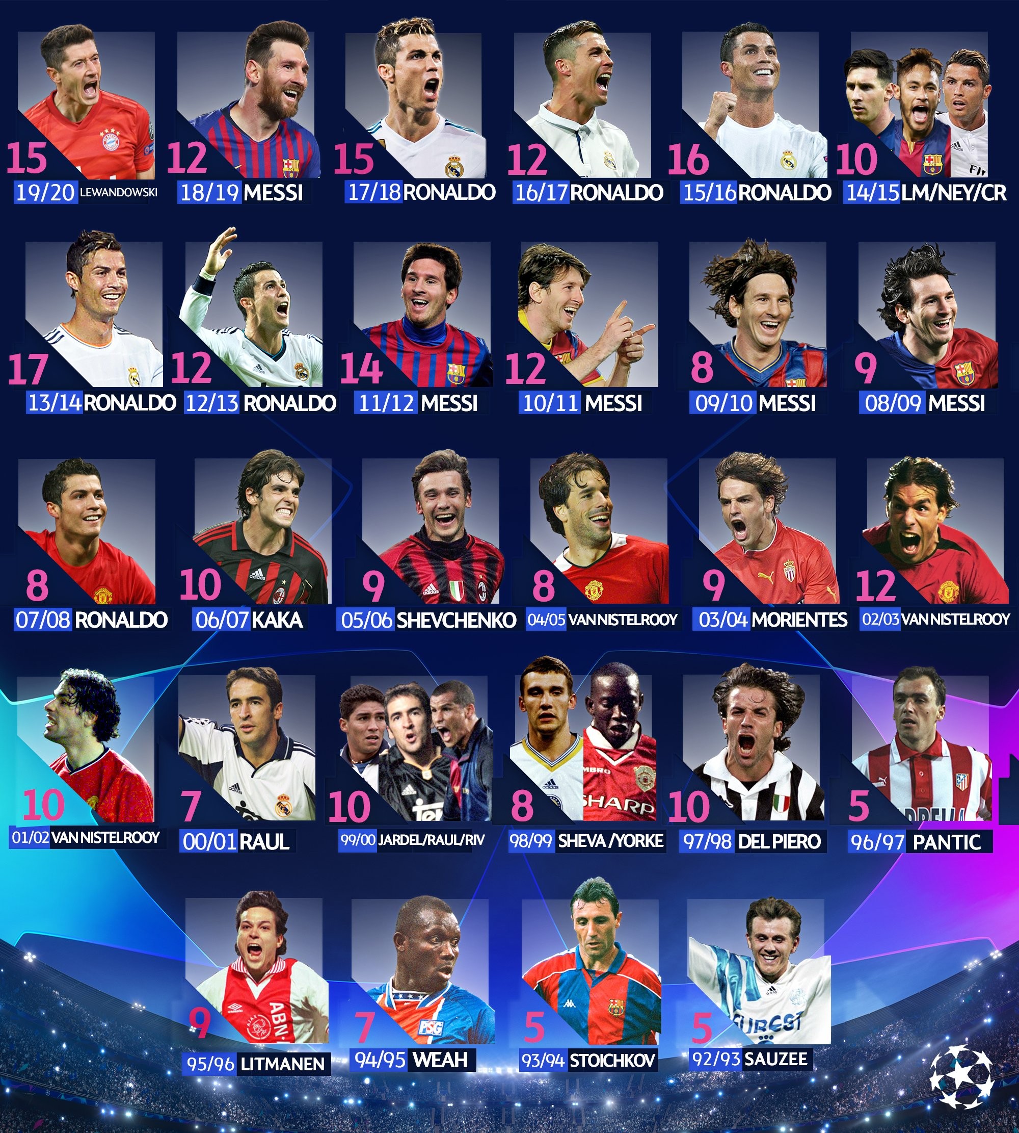 拜仁慕尼黑获得了本赛季的欧冠冠军,其中拜仁中锋莱万多夫斯基在本赛季的欧冠赛场攻入15球,获得了欧冠金靴。莱万也是欧冠在92-93赛季改制后,第一位获得欧冠金靴的拜仁球员。