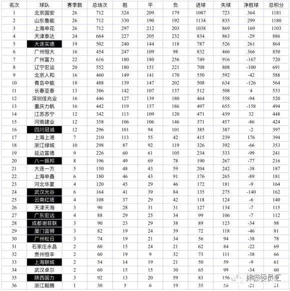 中国足球顶级联赛历史积分榜,截至2019年底,26年顶级联赛,北京国安712场顶级联赛凭借324场胜利拿到了1181分,同样是712场,山东鲁能330场胜利,1180分。
