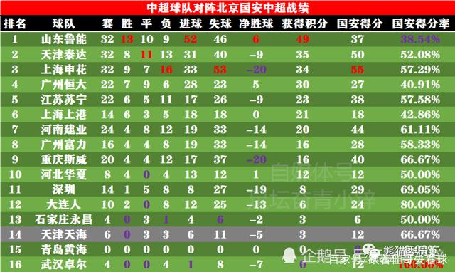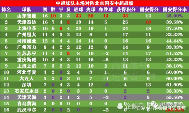再看在济南。山东鲁能: 胜场最多 (10)、 进球最多 (30)、 失球最多 (20) 、净胜球最多 (13)、 获得积分最多 (33)、 国安 得分率最低 (25%),无愧京师之外最大苦主。
