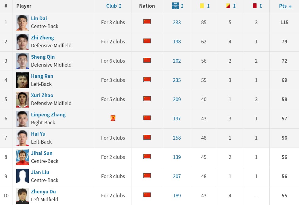 《德国转会市场》网站根据球员吃牌情况制作了排行榜,其中得一张黄牌积一分,两黄变一红积三分,直红五分。而戴琳以115分排在榜首,高出排在第二的郑智36分。