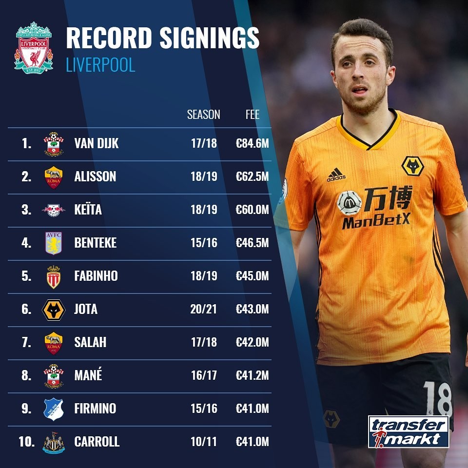 在若塔加盟利物浦后,德转盘点了红军史上十大最贵引援,其中范戴克以8460万欧元领衔,新援若塔以4300万欧元排在第6。