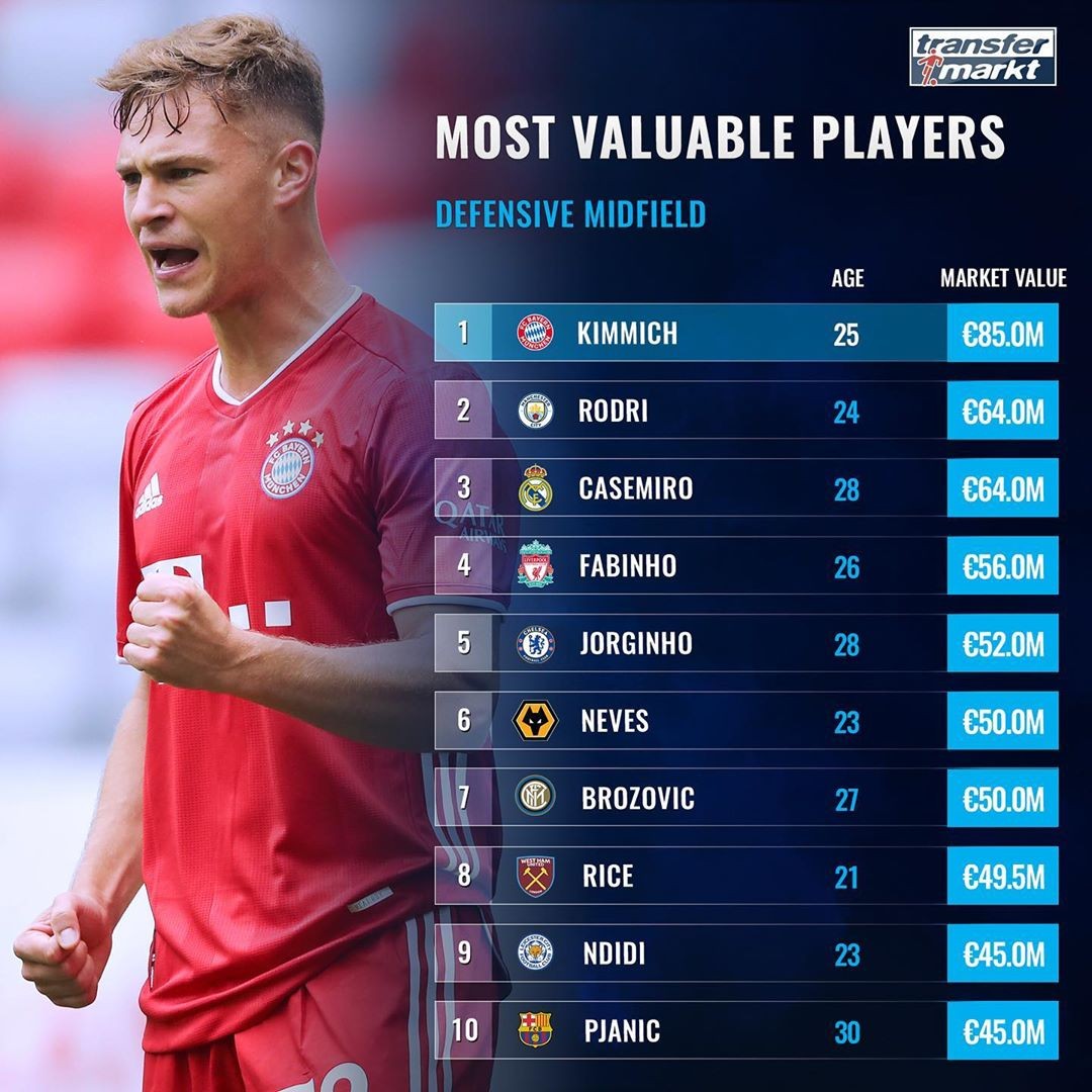 后腰球员身价排行榜(身价相同则年龄小者排名靠前):