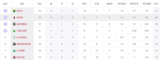 库亚巴上个赛季拿到联赛第8的位置,战绩为13胜13平12负,拿到52个积分。38场比赛打进43球丢40球,攻防两端的数据也比较正常。不过本赛季的库亚巴发挥出色,截至目前10轮联赛取得6胜3平仅1负的战绩,拿到21个积分,排在积分榜首位,目前打进14球丢7球,攻防两端的数据非常不错。