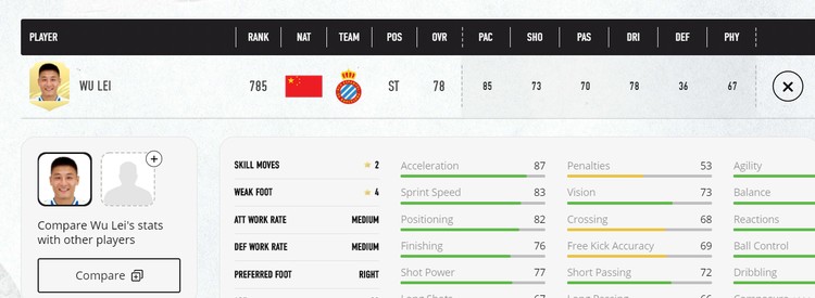 武磊能力值78,在单项能力值上:速度85、射门73、传球70、盘带78、防守36、身体67。相比较FIFA 20,武磊的综合能力值下降1分。