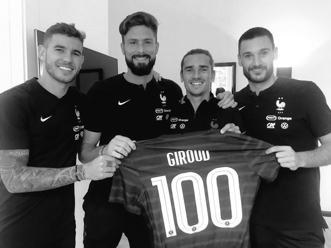 法国中锋吉鲁已经在上场对阵乌克兰的比赛中完成了自己法国国家队的百场里程碑,法国核心格列兹曼也在个人社交网站上祝贺了这位老大哥。