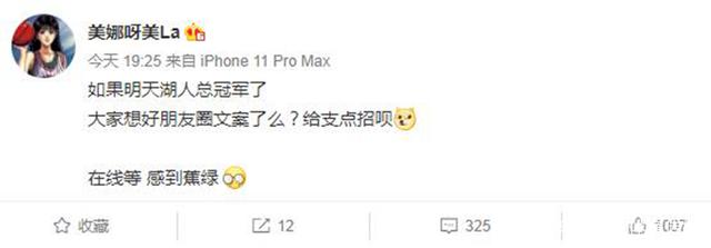 美娜在自己的社交媒体上表示:“如果湖人总冠军了,大家想好朋友圈的文案了吗?给支点招呗,在线等,感到焦虑。”虽然美娜在社交媒体上说出的是一句玩笑话,但是却引来了很多湖人球迷的回复,而湖人队的球迷们也充分地展示了自己的才华。有球迷表示:“他在三支不同的球队拿到三个冠军,他是我们这个时代最伟大的球星,他的名字就是丹尼-格林,我爱他。”