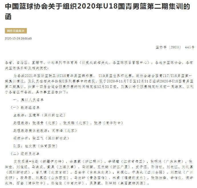 为备战2021年国际篮联亚洲U18青年男篮锦标赛、 U19男篮世界杯比赛,中国篮球协会结合国青U17/U18男篮第一期集训情况,及队员在相关年龄段U系列赛事中的表现,现于2020年11月7日至12月31日组织2020年U18国青男篮第二期集训。如第十四届全运会预赛开赛的时间确定在12月31日前,则集训将于预赛确定时间前一周结束,以利于各省区市备战。