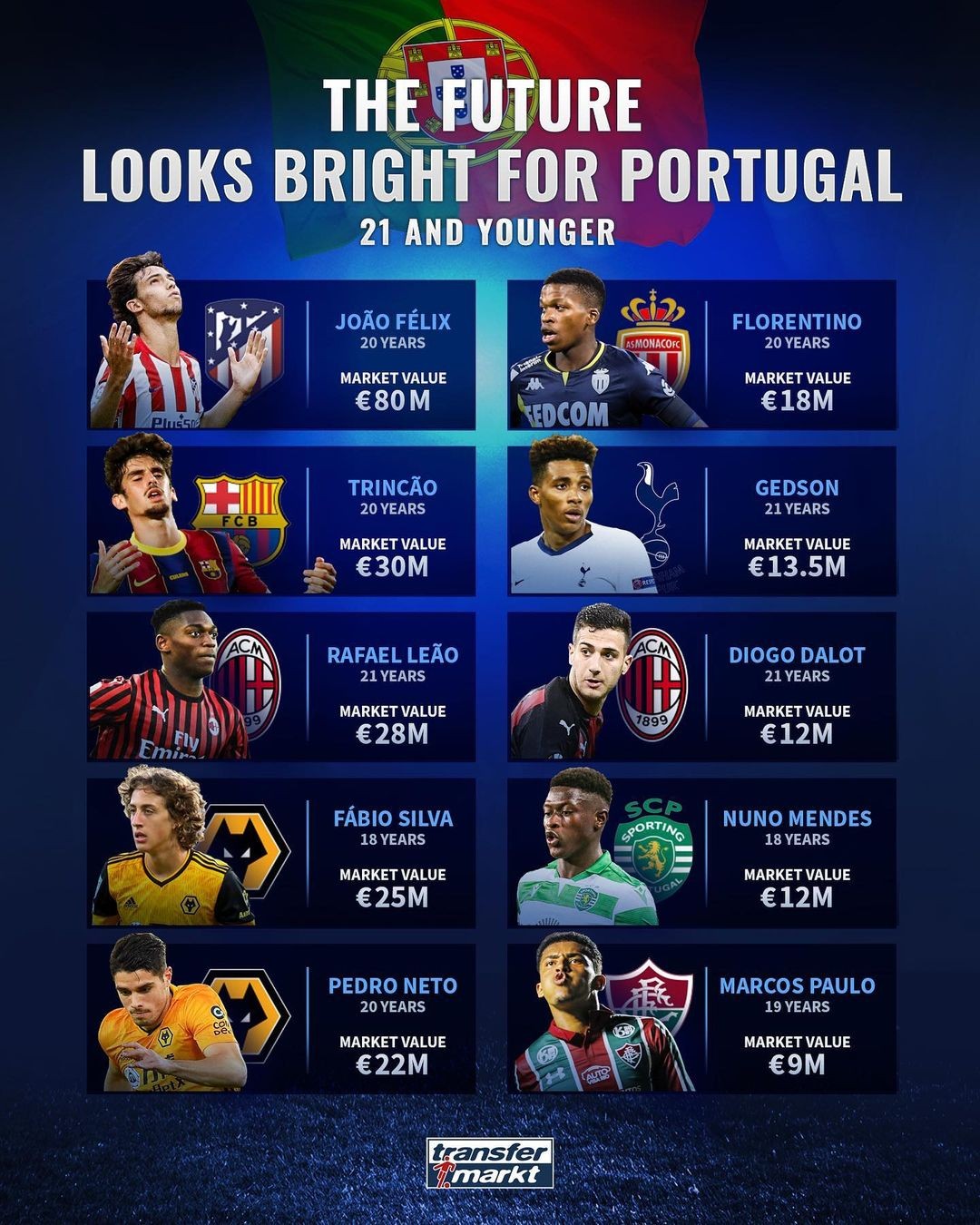 德国“转会市场”近日公布了葡萄牙21岁以下球员的身价排行榜,马竞前锋菲利克斯以8000万欧元的市场价值高居榜首。