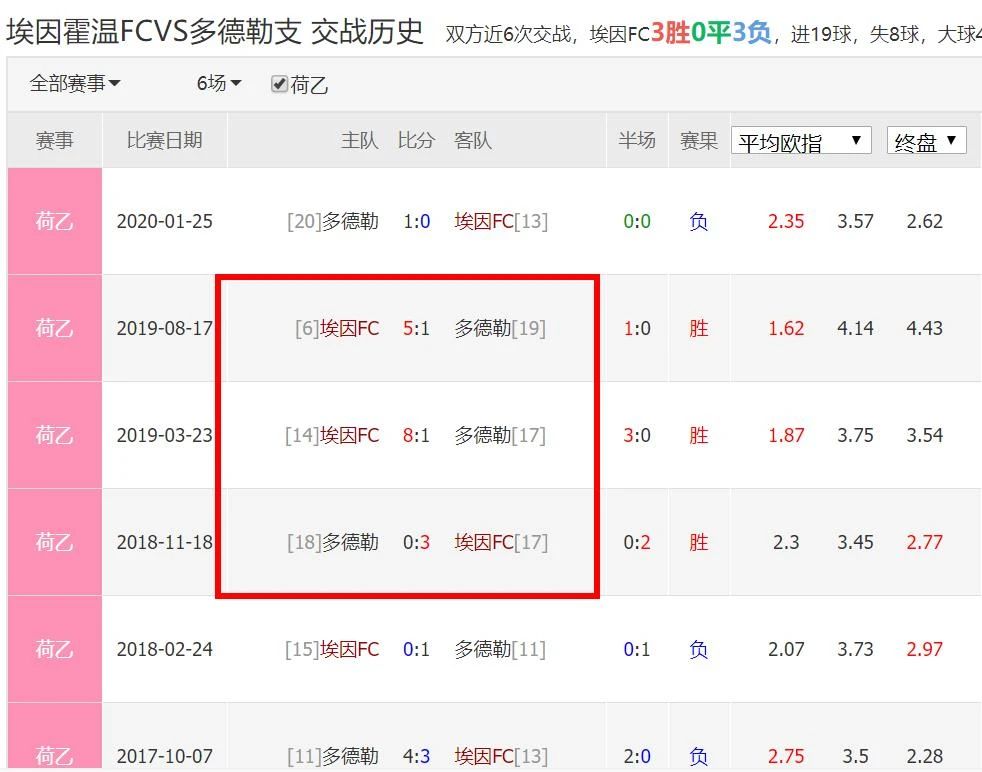 两支球队最近6次交手,埃因霍温取得3胜3负的战绩,并无太多优势。但最近4次交手获胜3场,同时这3场比赛打进16球之多,连续2个主场大胜多德勒支。