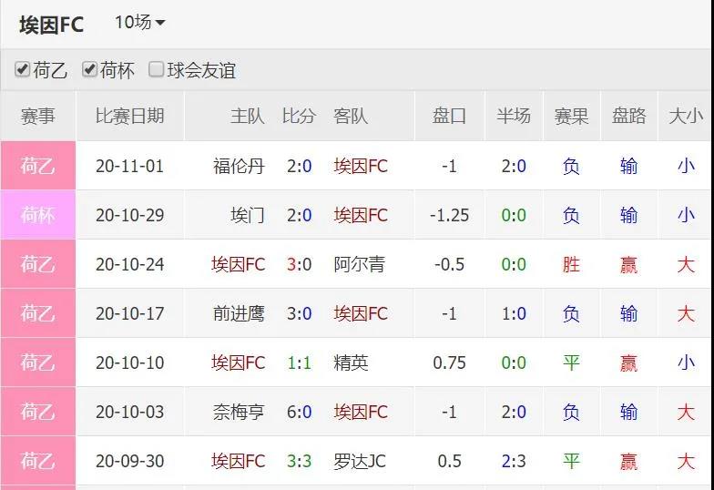 埃因霍温FC上轮联赛做客的情况下挑战福伦丹,对手实力较强,埃因霍温FC实力不济,最终0-2败下阵来。加之之前的荷兰杯赛事客场0-2输给荷甲球队埃蒙,球队在近期遭遇连败,最近4场比赛球队战绩也仅为1胜3负,整体发挥很不理想。