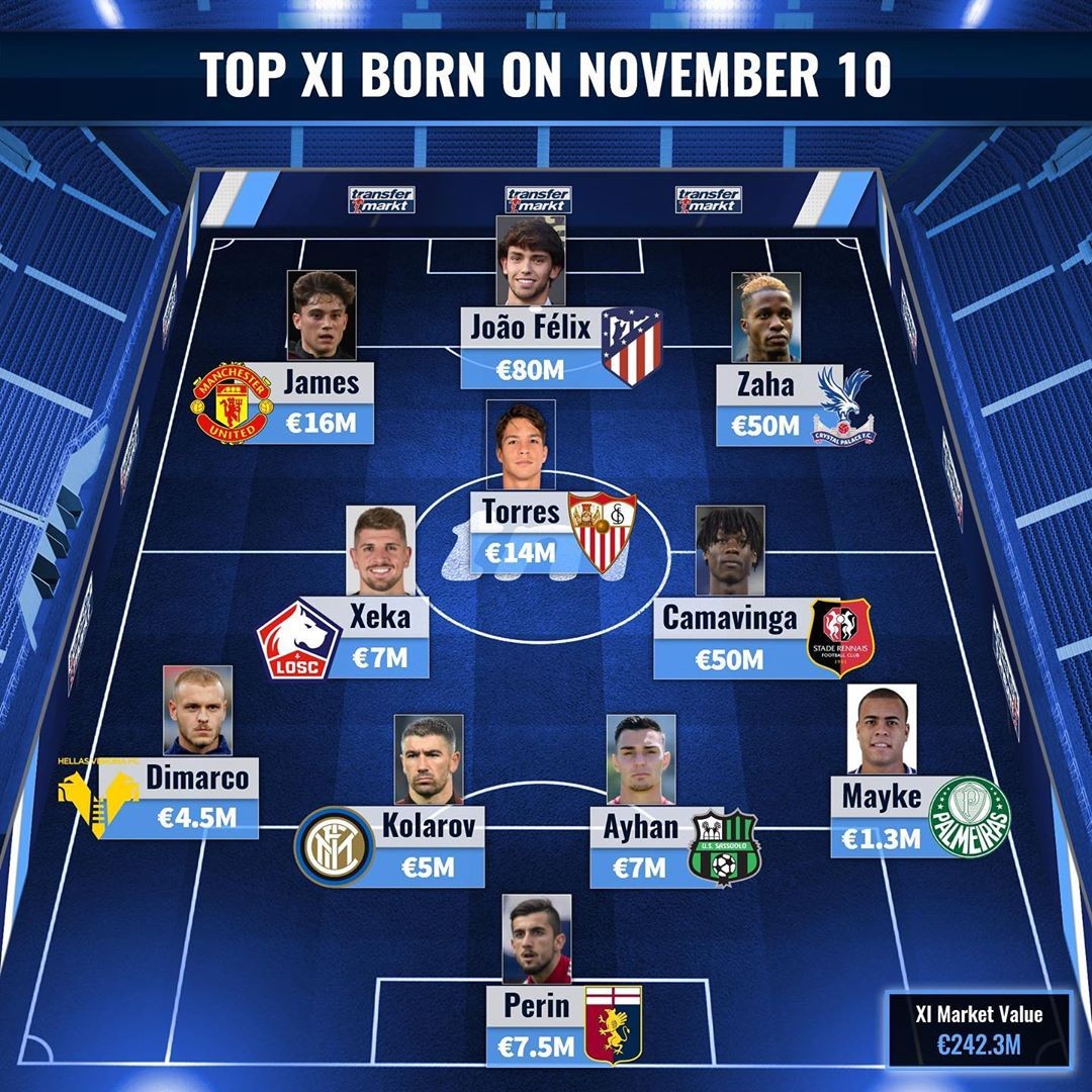 德国转会市场网站评选了11月10日出生的球员最贵阵容,马竞前锋菲利克斯以8000万欧领衔,卡马文加和扎哈也都位列其中,这一阵容总身价达到2.423亿欧。
