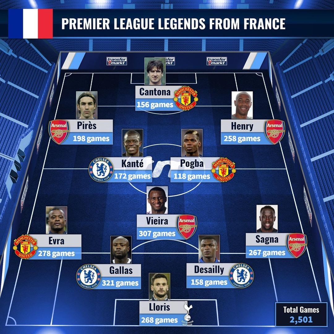 德国转会市场网站评选了英超史上法国球员最佳阵容,枪手名宿亨利领衔,现役球员中博格巴、坎特和洛里也位列其中。