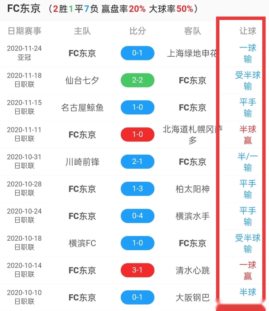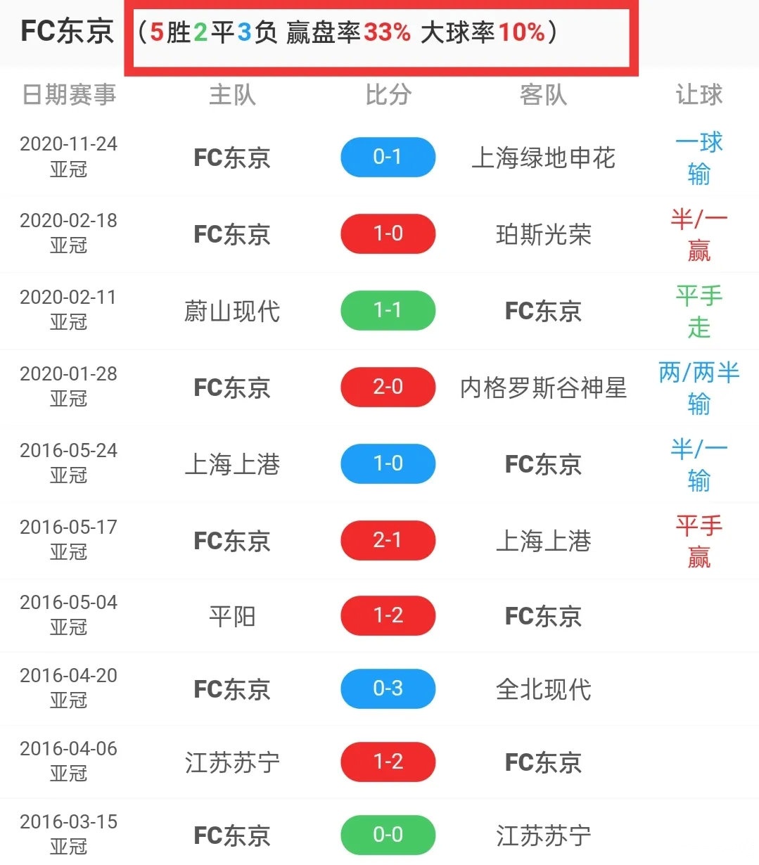 东京FC最近10场亚冠5胜2平3负,但是其赢盘率却只有33%,而且进球效率不高,10场比赛只有4场踢出大比分,1场大球,侧面说明球队的进攻端比较薄弱;最近10场各项赛事的赢盘率也只有20%,比上海申花低上整整60个百分点!
