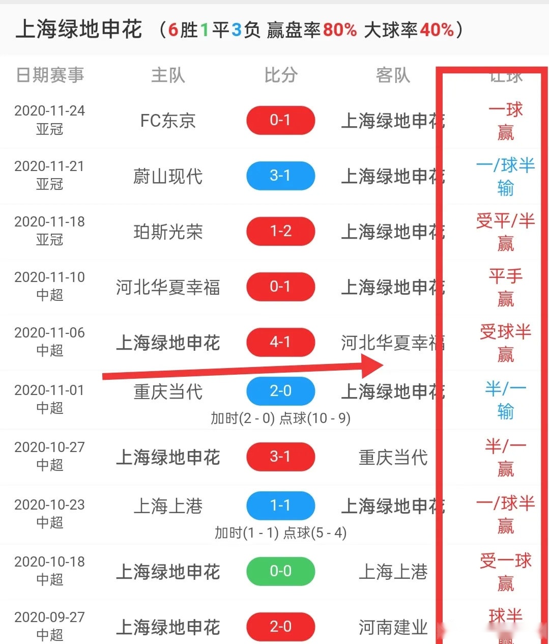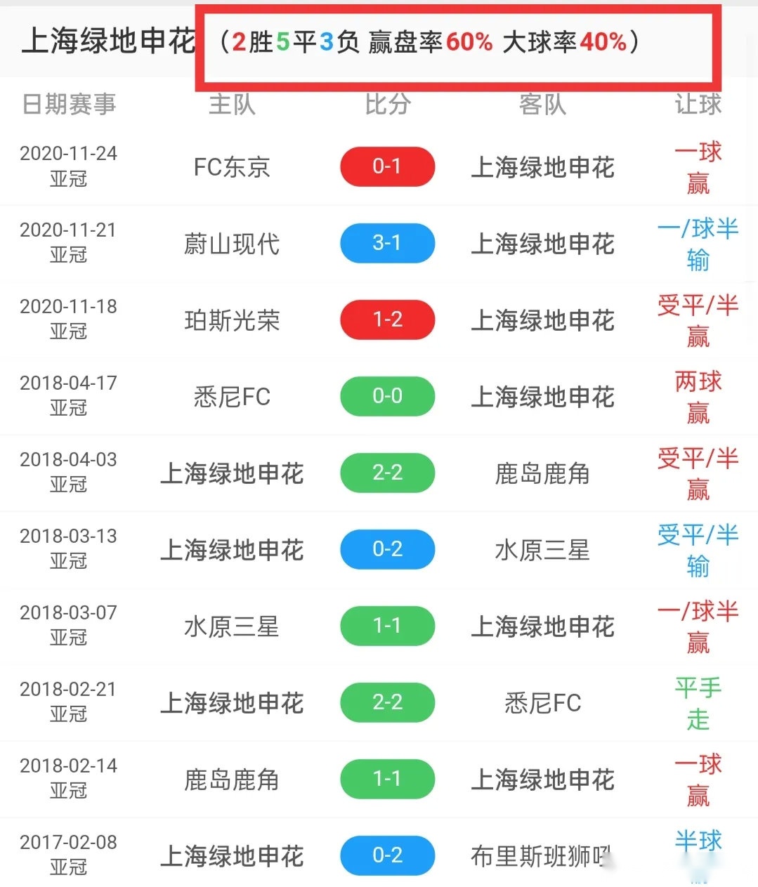 首先来看看近期双方在亚冠场上的赢盘率: