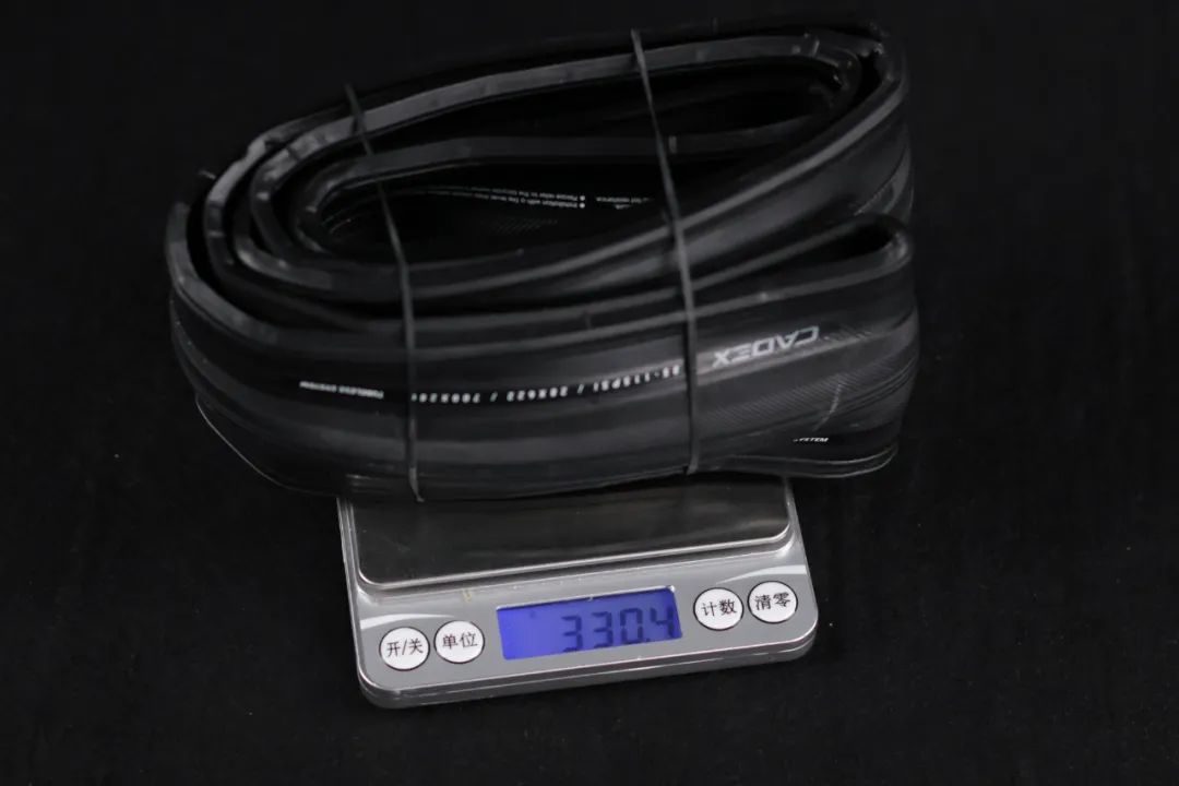 28C宽度约330g的重量,属于较重的产品。考虑到CADEX以及捷安特品牌旗下的一些直边框真空轮组对轮胎的兼容性有要求,CADEX自家的真空胎是一个安全选项。