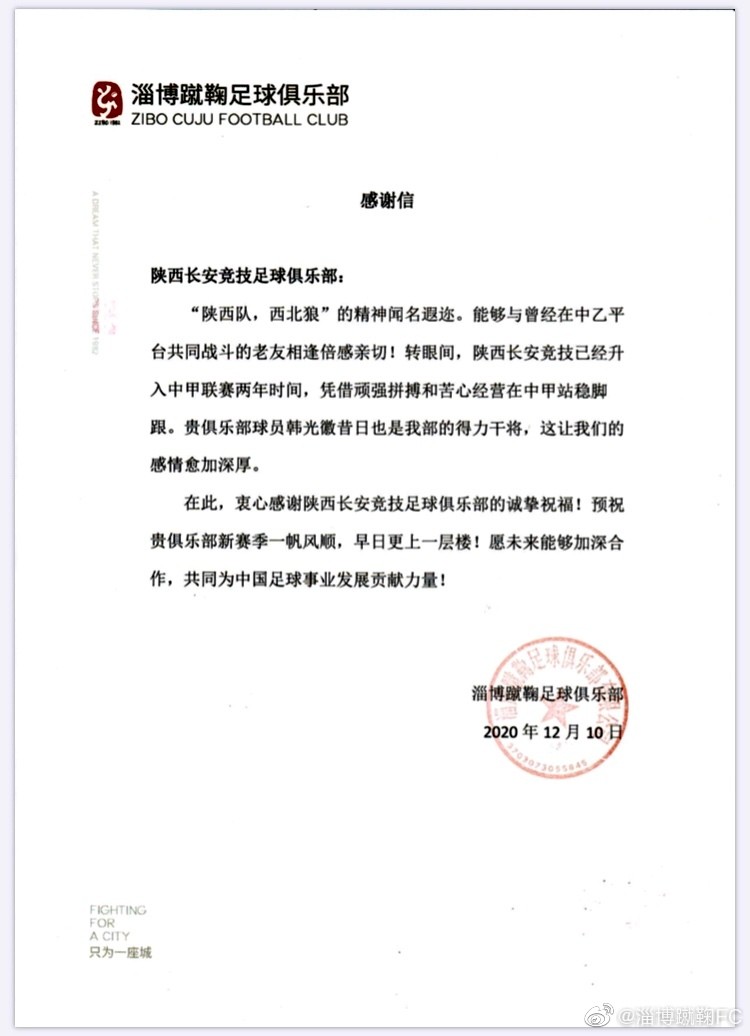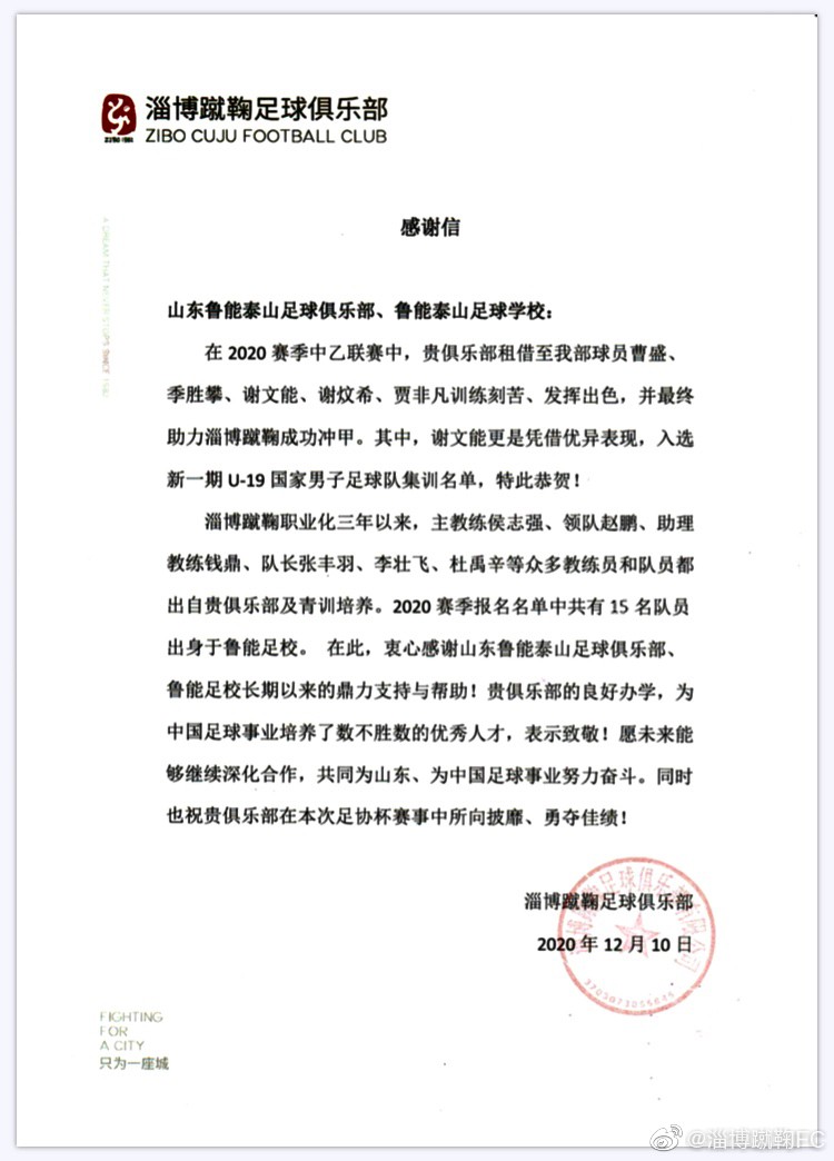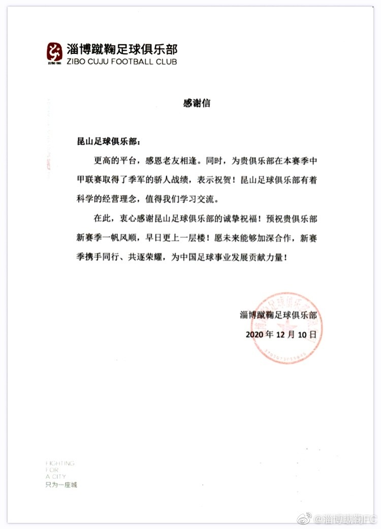 随着球队的冲甲成功,淄博蹴鞠足球俱乐部官方发布了多封感谢信,感谢多家俱乐部对球队的关注与支持。