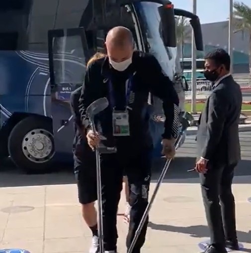 据亚足联官方社交媒体发布的动态,由于伤病没能入选神户胜利船与蔚山现代比赛的伊涅斯塔,在住着拐杖的情况下依然跟随球队一同来到了比赛场地。