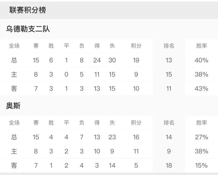 奥斯荷乙联赛目前也是赛15轮,以4胜4平7负积16分排名14紧跟主队,以一场净胜球落后主队3个积分。得失比:13/23,场均进球不足1球,丢球数达到了1.5球,攻防两端状态都不在线。