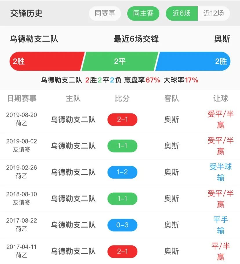 本赛季主队乌得勒支二队以6胜净胜球方面优于客队奥斯的4胜;