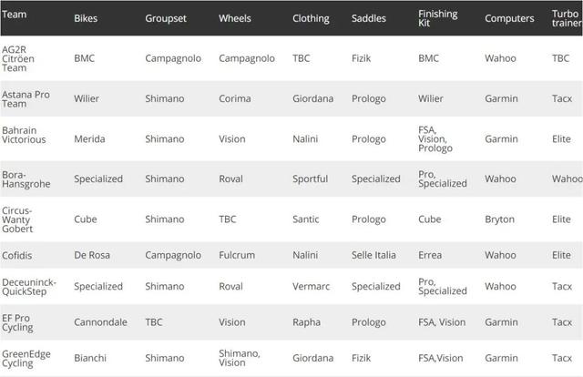 自行车:Colnago V3Rs、Colnago Concept 套件:Campagnolo Super Record EPS 服装:TBC 轮组:Campagnolo 座垫:Prologo 配件:Deda 码表:TBC 骑行台:Elite