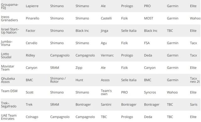 码表方面,佳明以九支使用车队冠绝群雄,但Wahoo的突飞猛进也值得关注,下赛季将会有五支车队使用。两支在3020年还使用SRM的车队也选择了拥抱未来,比利时乐透将使用佳明,科菲迪斯将使用Wahoo,帝斯曼车队也将使用Wahoo,不过他们之前的赞助是Sigma,预计UAE车队也将更换码表选择。旺蒂车队在2021年将会使用百锐腾,百锐腾也是2020年以色列创业国的码表提供商。