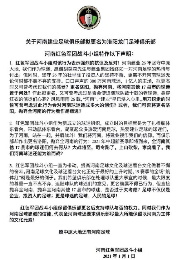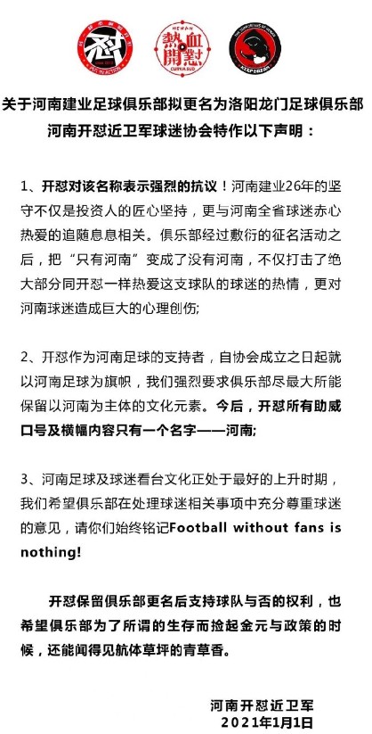 在河南建业官方宣布拟改名为洛阳龙门后,建业的三大球迷团体建业红魔、开怼近卫军和红色军团均发声表达抗议和不满。