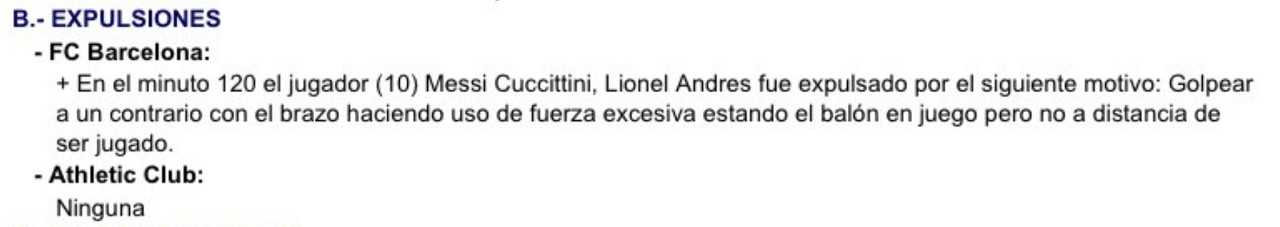 本场主裁判是希尔-曼萨诺,在他的裁判报告中,他这样描述了梅西的红牌:“比赛第120分钟,巴萨10号球员梅西因以下动作染红:在比赛进行途中,但在没有直接参与比赛的情况下,梅西用过度的力量击打了对手的球员。”