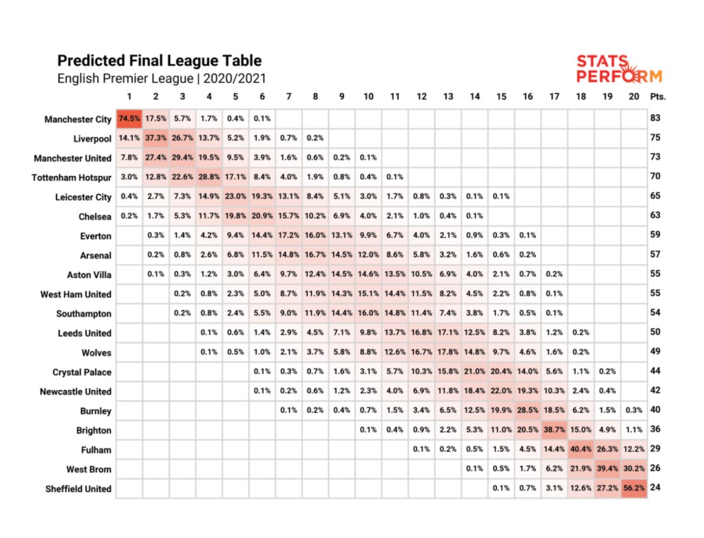 根据Opta的数据模拟,拥有夺冠机会的球队包括曼城、利物浦、曼联、热刺、莱斯特城和切尔西,其中夺冠几率最大的是曼城,可能性高达74.5%。