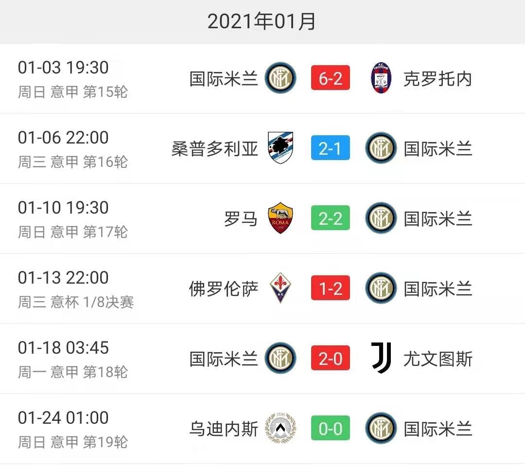 北京时间1月27日凌晨03:45,意大利杯1/4决赛将迎来米兰德比。在进入2021年后,国际米兰6战3胜2平1负。
