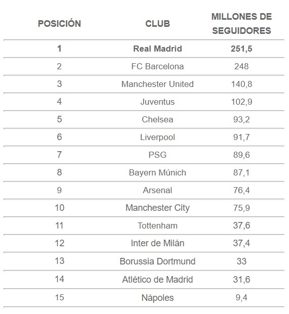 皇家马德里在世界5大主流社交媒体平台的粉丝总数超过2.5亿人。