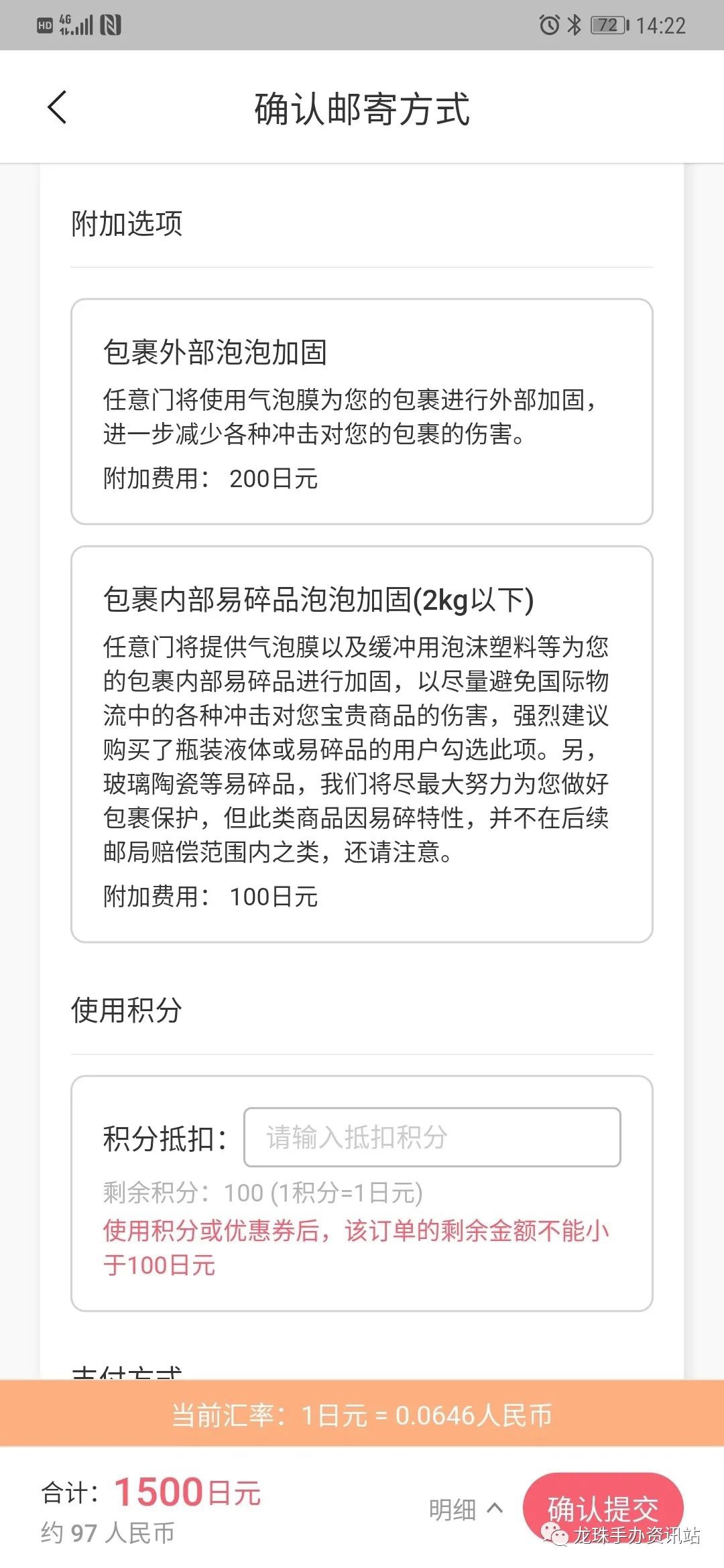 竹蜻蜓 ,速度到现在表现都不错,10到20日到手,国内断运费有中通快递承担,价格不高一般都是免税,价格高的商品但又符合寄送条件的都是把关税算在运费里头。 下图是同一只SMSP 超4孙悟空的运费比较。附加选项为可选项,加固打包的额外收费服务。