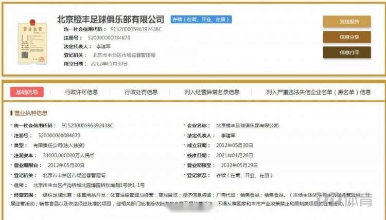 1月28日,据国家企业信息公示系统显示,北京人和已正式更名为北京橙丰足球俱乐部。