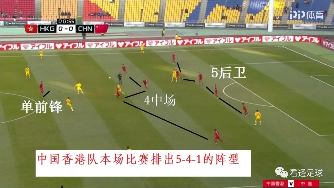 中国香港队本场比赛排出了一个 5-4-1的防守阵型 。如下图所示,为什么要排出一个5-4-1的阵型?其实原因很简单: 压缩空间,立足防守 。中国香港队目前世界排名139名,作为一支弱队,要有弱队的打法,什么打法?那就是防守反击。