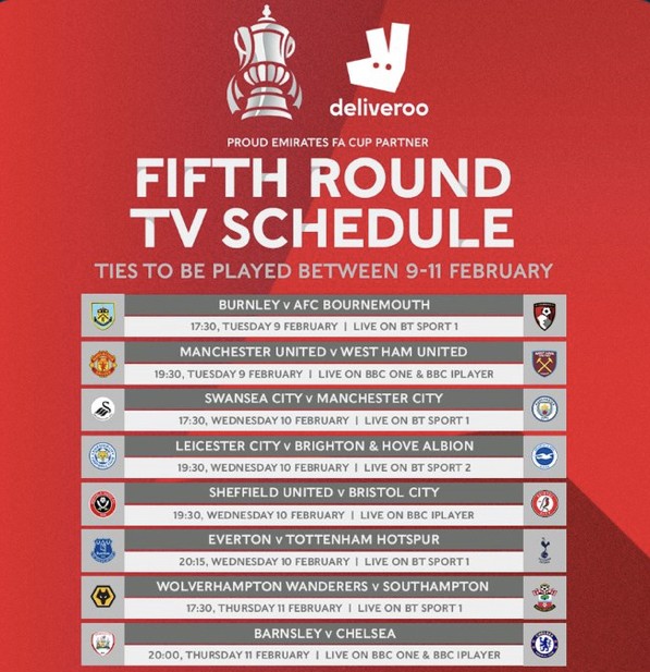 英足总已经公布了足总杯第5轮的比赛赛程,这八场比赛将在北京时间2月10日-2月12日之间进行,并且全部安排在了北京时间凌晨以后进行。