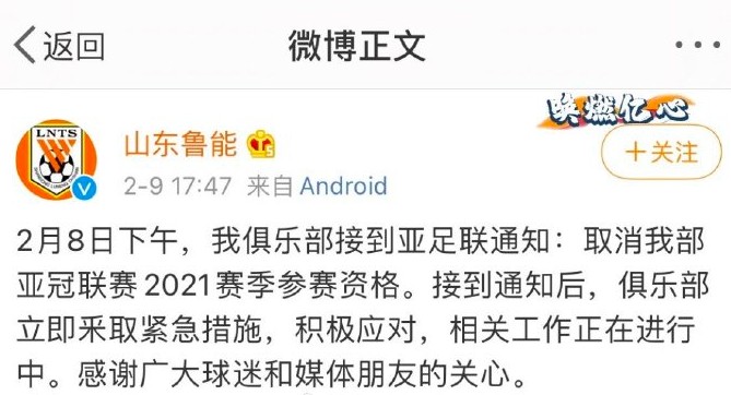 2月8日下午,我俱乐部接到亚足联通知:取消我部亚冠联赛2021赛季参赛资格。接到通知后,俱乐部立即釆取紧急措施,积极应对,相关工作正在进行中。感谢广大球迷和媒体朋友的关心。