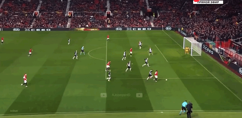 如下动图所示,万比萨卡通常能够在边路高度压上接队友的传球后为本方中路的攻击手送出致命的横传助攻,以此把球队边路进攻威力更好的发挥出来。