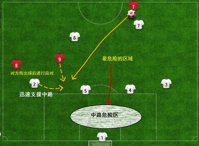发现中路出现危险时,边后卫应迅速向中路支援与队友进行配合