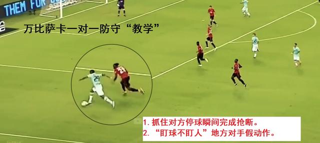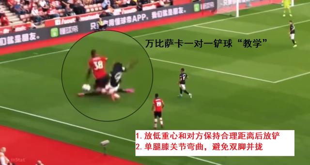 如上动图所示,当右边后卫万比萨卡发现中路空虚,众多对手都在向中路球门方向靠近时,万比萨卡果断放弃自己的边路防区,向中路补位,并选择了自己最擅长的防守方式——滑铲,完成了关键位置上的关键解围。