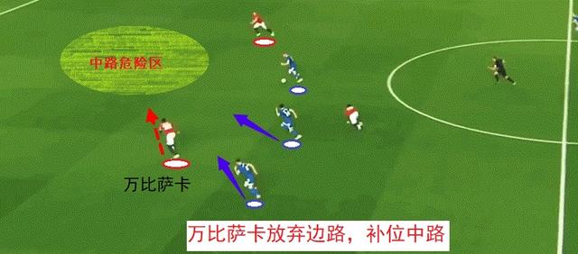 当球队中路有危险时,万比萨卡迅速向中路靠近,填补中路漏洞。