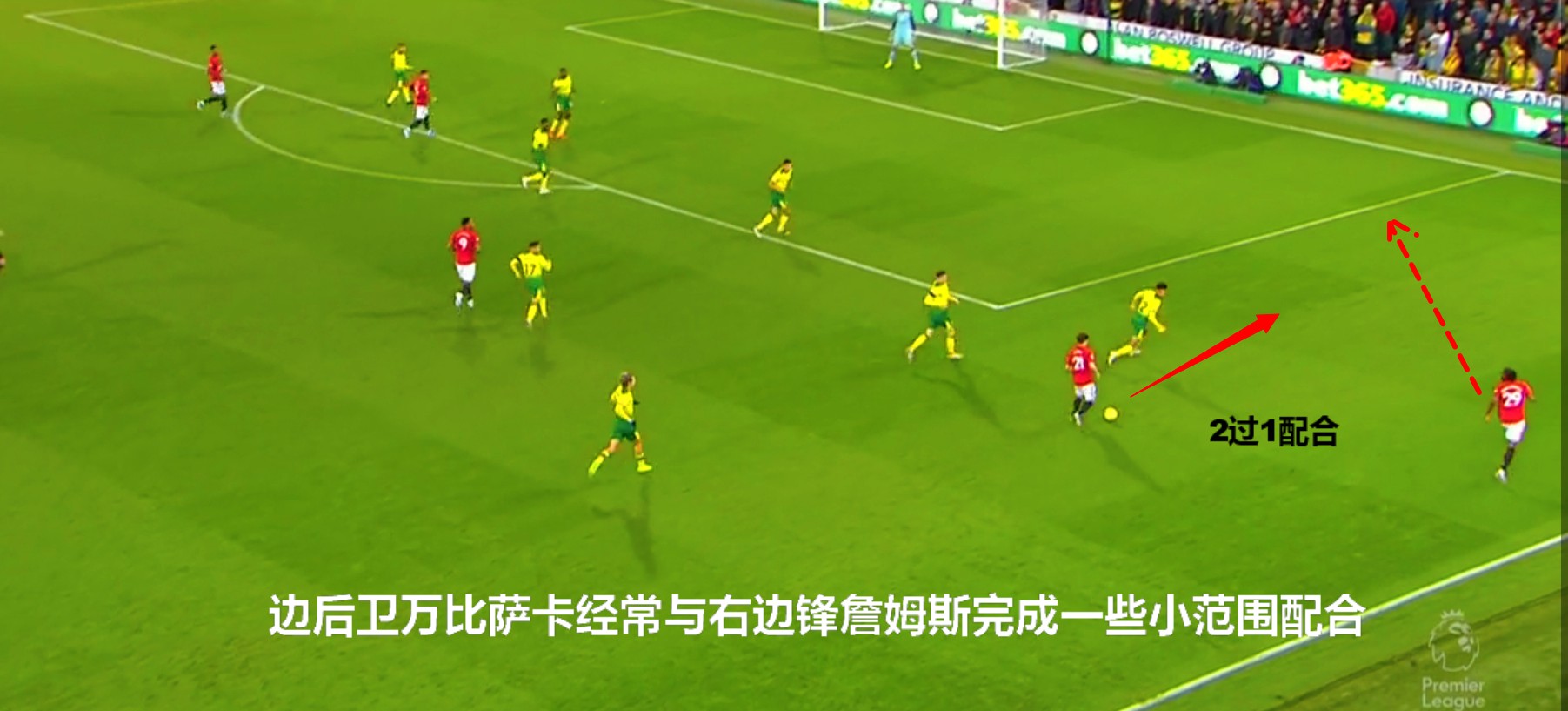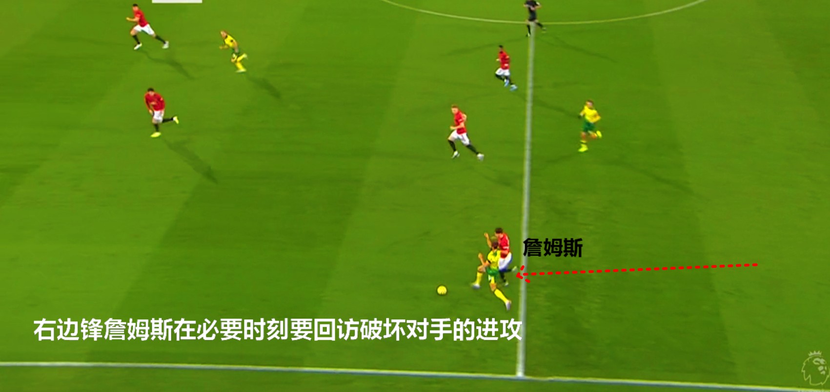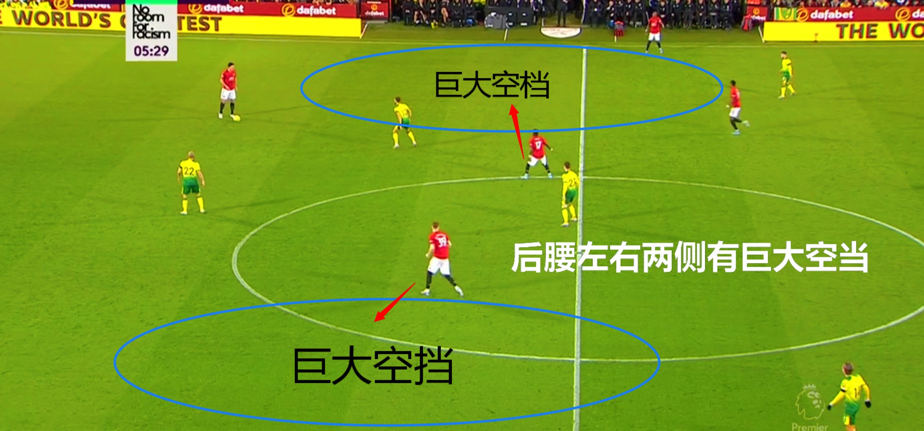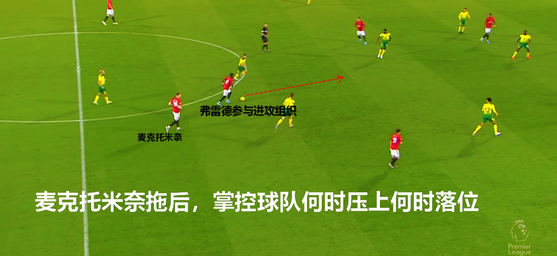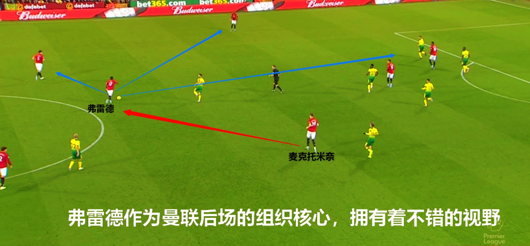 我们以英超联赛第10轮曼联客场挑战诺维奇的比赛为例。由于博格巴的缺阵,曼联双后腰搭配由原来的博格巴加麦克托米奈变成了弗雷德加麦克托米奈。弗雷德在曼联双体系中跟博格巴的职责一样,进攻时要在后场梳理球路。