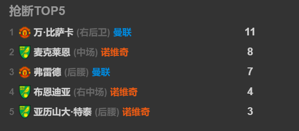 曼联这个赛季新引进的边后卫万比萨卡在这一方面就做的很出色,他的拦截意识,抢断成功率,抢断次数都很高 ,下图是曼联与诺维奇的比赛中抢断数据,万比萨卡排在第一名。