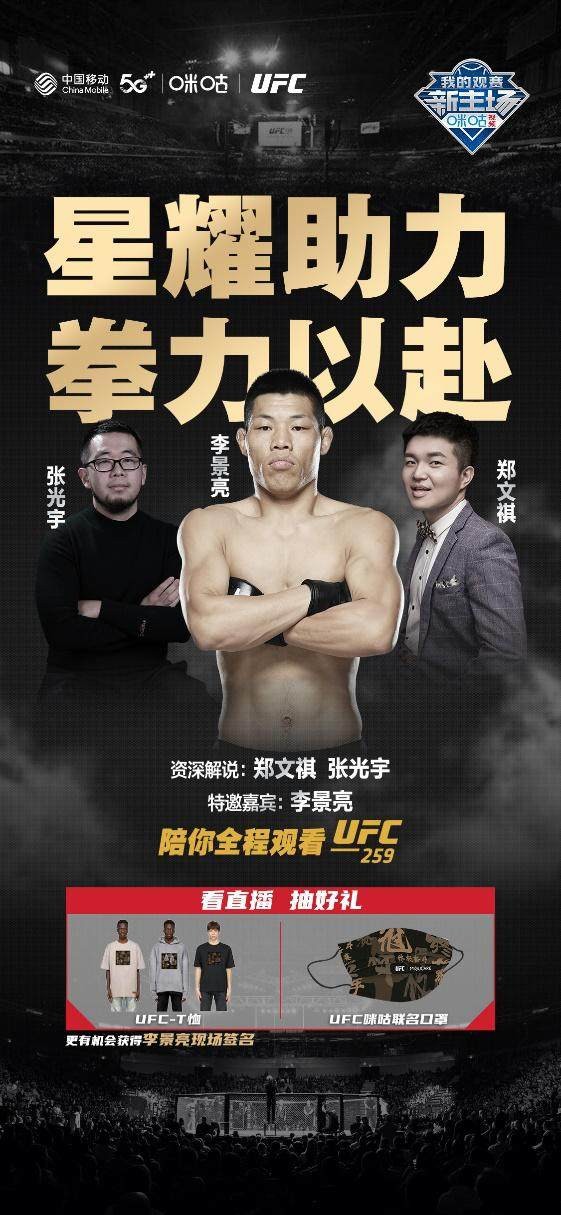 赛事之外,中国移动咪咕将在UFC首场直播中为广大格斗爱好者带来全新的观赛体验,打造沉浸式UFC观赛新主场。本次,咪咕将邀请UFC明星选手李景亮搭档资深解说组合郑文祺、张光宇组成UFC259解说天团。为了增强观众的临场感,咪咕将打破传统的演播室直播模式,将直播间搬到UFC精英训练中心咪咕专属八角笼内,打造UFC中国史上首个极具现场感的“八角笼直播间”。届时,三位解说将身着具有UFC特色的服装在八角笼内,以最UFC的方式为拳迷们带来专业的赛事解说,李景亮还将现场签名,为粉丝送出UFC官方精美礼品。