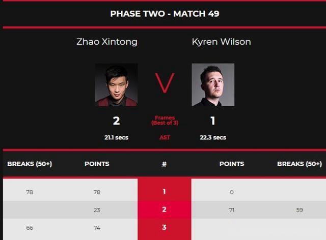 本场比赛,赵心童一上来一改前五轮的低迷状态,他打出单杆78分,78-0零封威尔逊,1-0取得开门红。第二局,威尔逊打出单杆59分,71-23扳回一局,比分追成1-1。