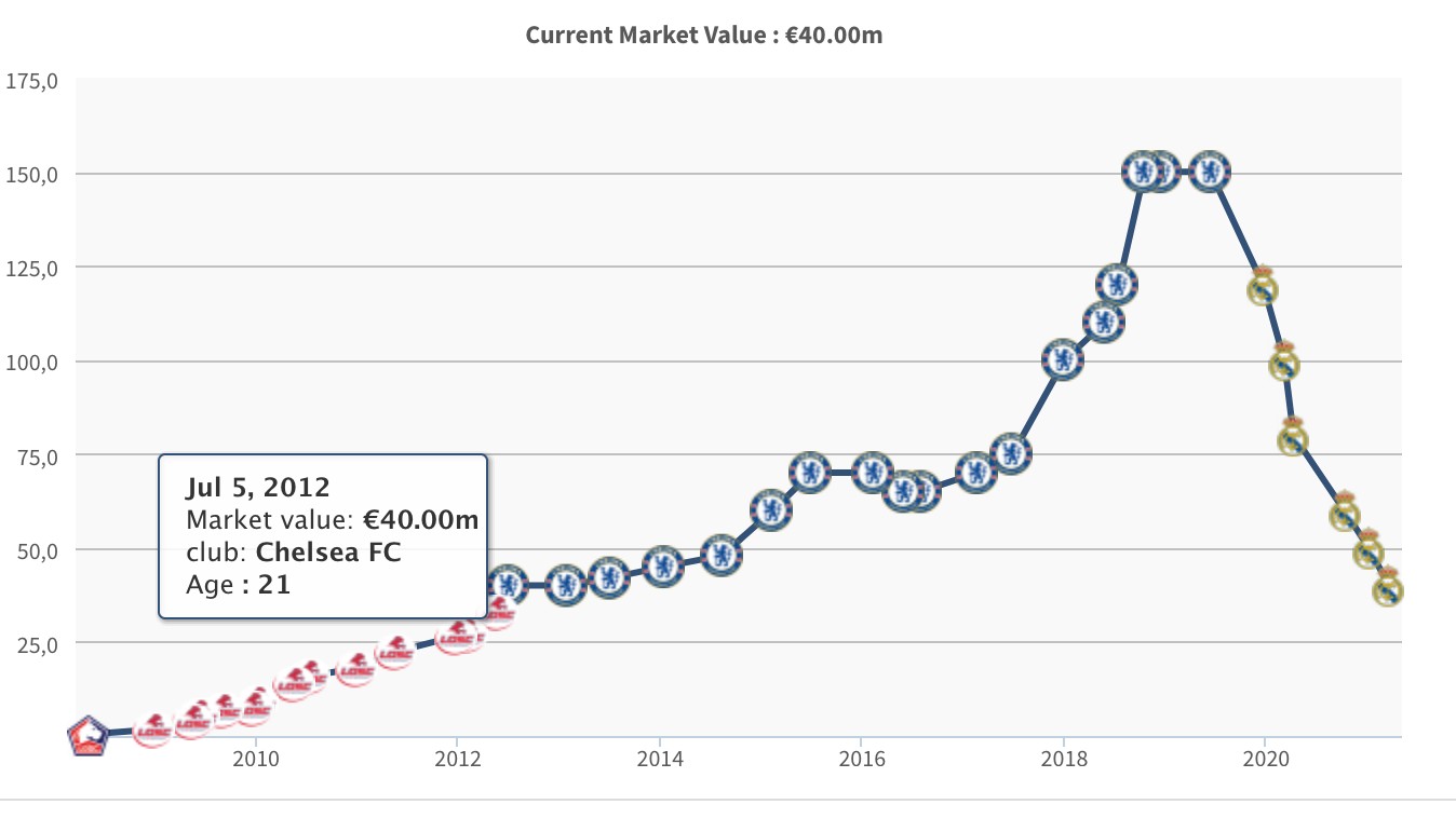 据统计,这是阿扎尔自2012年以来的最低身价,当时他的身价也是4000万欧元。另外,阿扎尔的巅峰身价是在2018年,曾达到过1.5亿欧元。