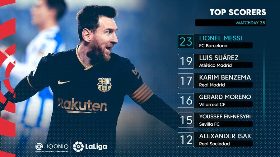 联赛28轮过后,梅西一共在西甲联赛中打进了23球,这让他在西甲射手榜上有了4球的领先。排名第二的是苏亚雷斯的19球,乌拉圭射手本轮联赛中同样完成了破门。